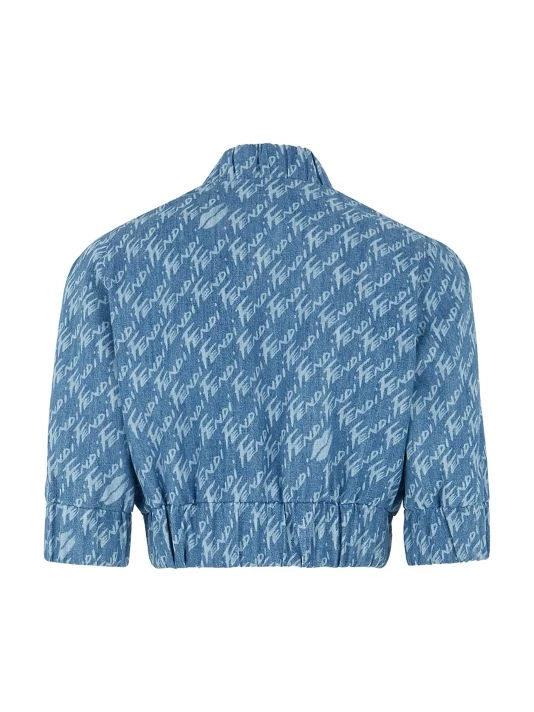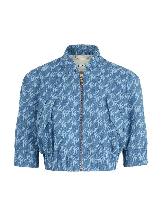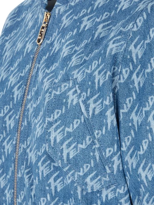 This sleek denim jacket is adorned with a brushed logo throughout the design, crafted of Italian cotton and silk.