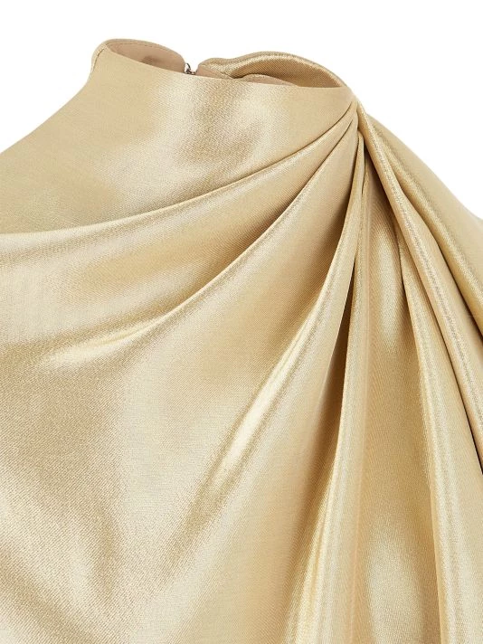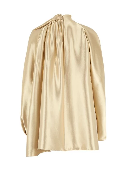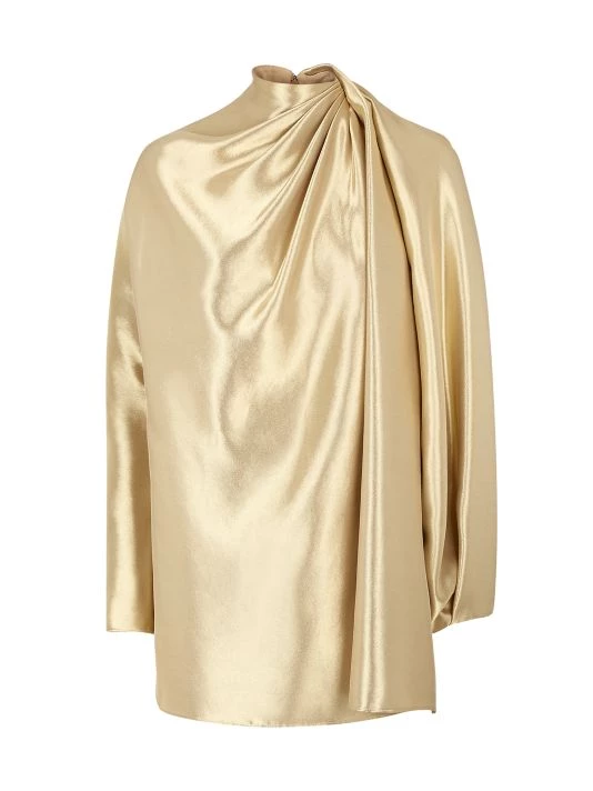 Woven of a lustrous silk blend, this dress is defined by dimensional gathering at mock neck and draped cape sleeves.