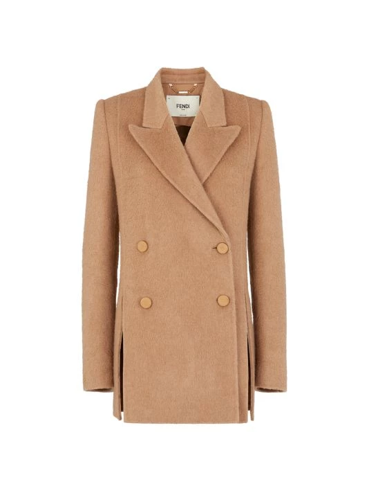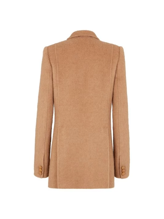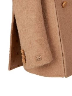 Structured camel hair coat with contrast buttons and allover branding at interior.