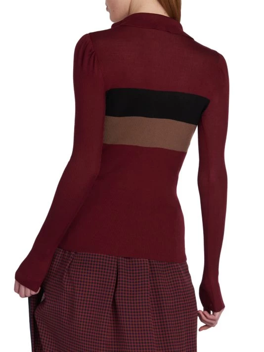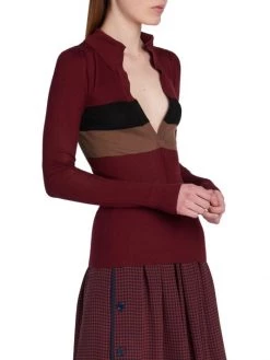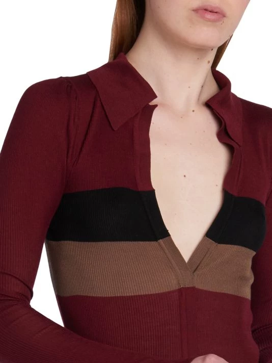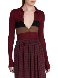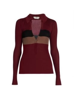 This slim silk ribbed top has a collared silhouette and deep V-neck that hugs the figure for a flattering fit.