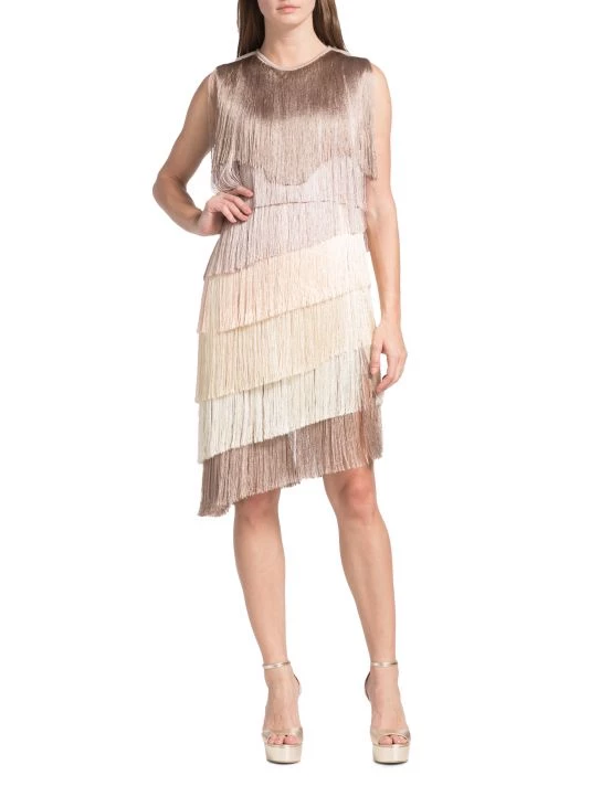 Fendi’s colorblocked knee-length dress is constructed of tiered asymmetric fringe.