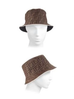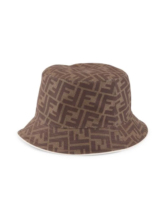 Fendi’s denim bucket hat is detailed with a repeated logo pattern.