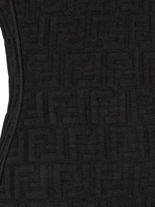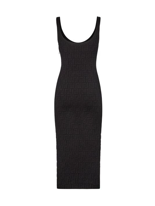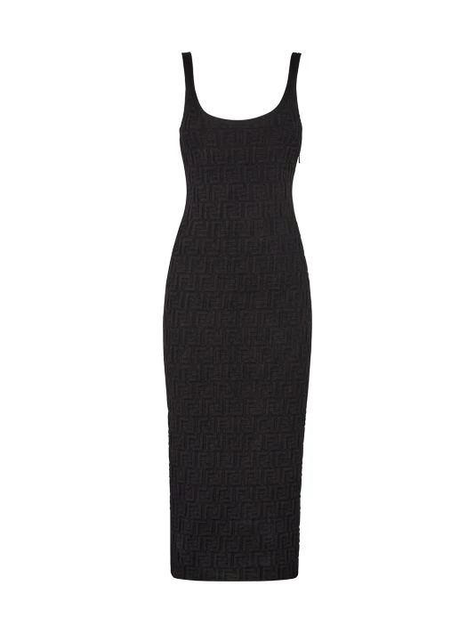 This fitted midi-length dress features a minimalist scoopneck and thin shoulder straps, enhanced with embossed FF monogram throughout the design.