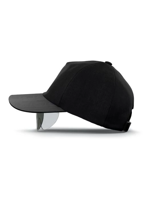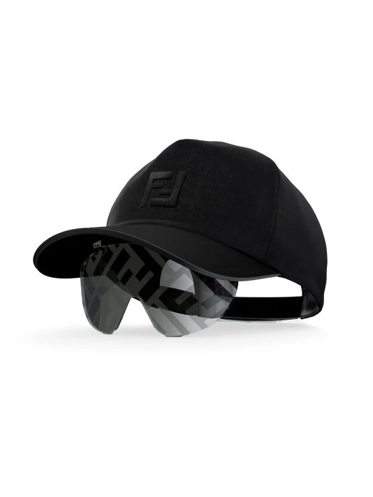 This Fendi eyecap features the FF logo print on the mirrored lenses. With an attached baseball cap, these lenses offer 100% UV protection.