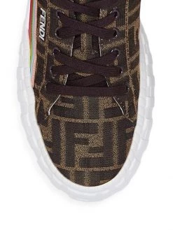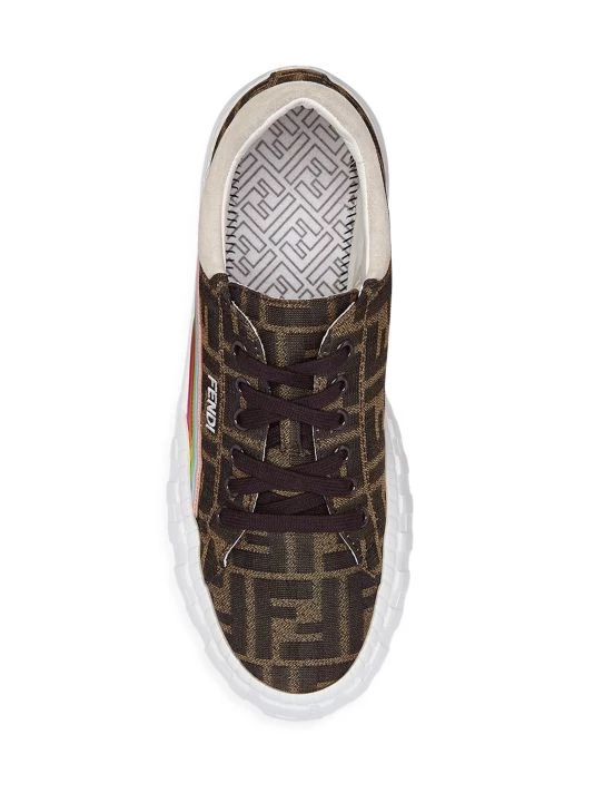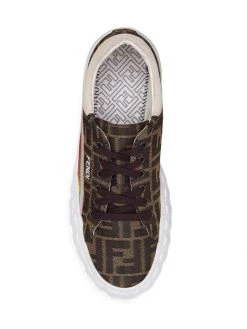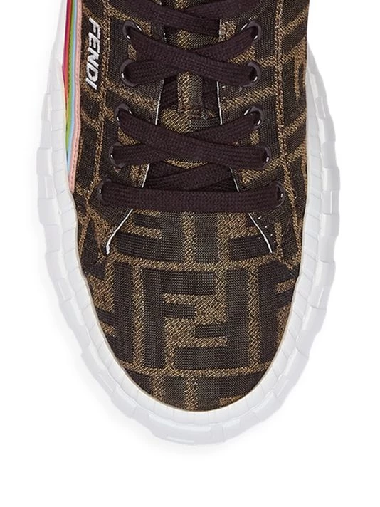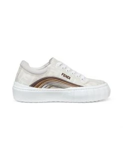 Fendi’s low-top sneakers are crafted of FF-monogram-coated canvas. This style boasts a bold platform with a rainbow motif at the side.