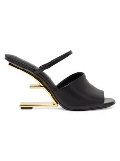 Elevated with a diagonal F-shaped sculpted heel, these sleek sandals are topped with smooth leather straps.