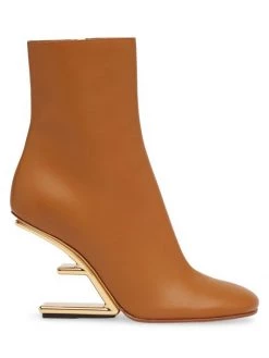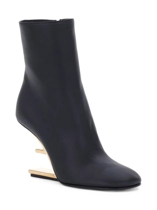 Elevated with a diagonal F-shaped sculpted wedge heel, these statement boots are rendered in rich Italian leather.