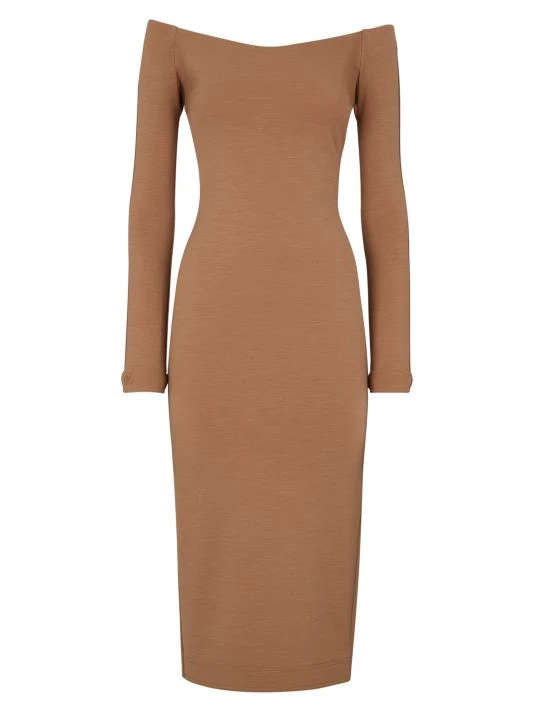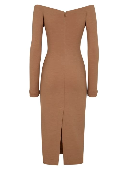 Bodycon dress with an off-the-shoulder neckline and breezy back slit.