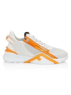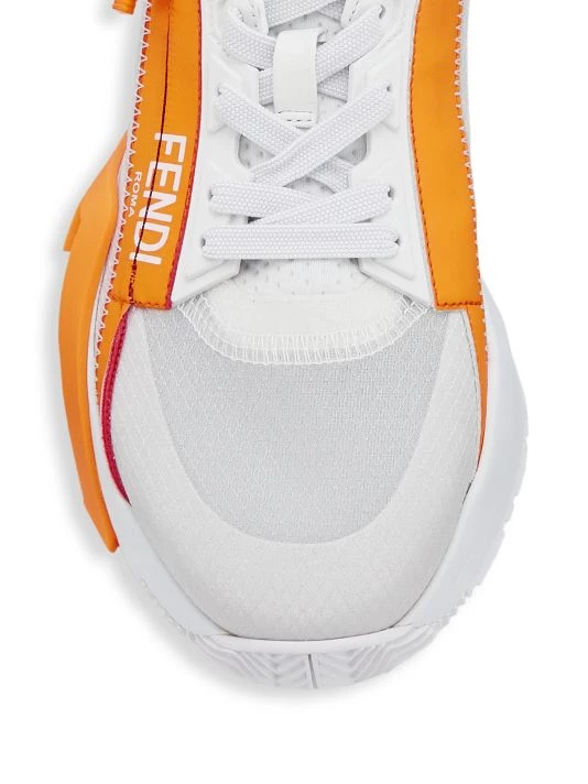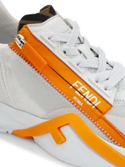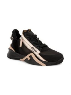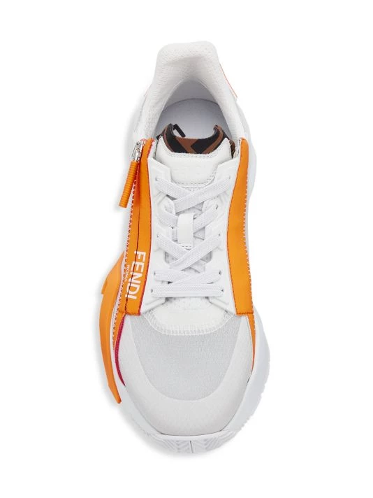 Mixed-media sneakers topped with zipper detail and signature logo trim.