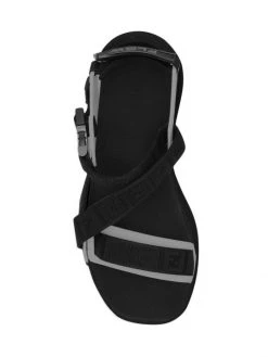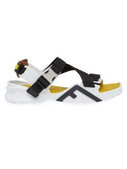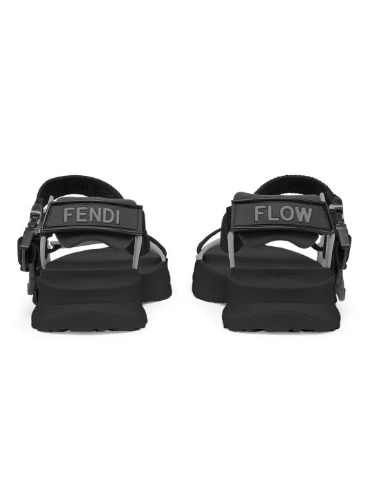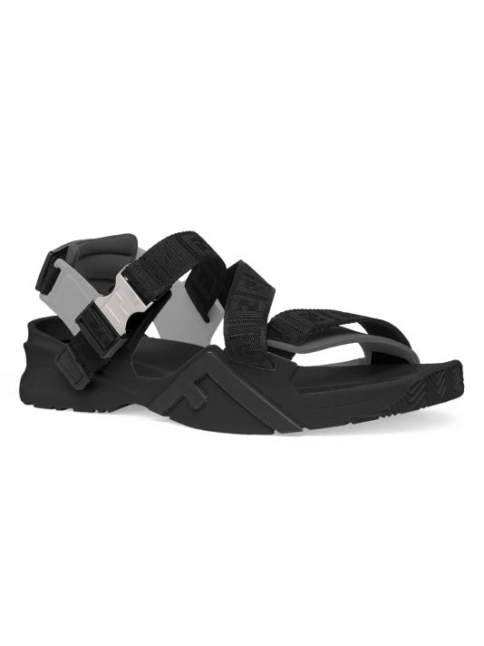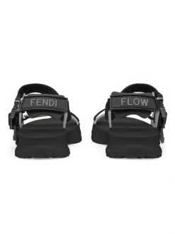 Featuring pastel and earth-tone intarsia shirts and shorts, and bombers depicting cityscapes, this collection reimagines inky nighttime silhouettes and aerial perspectives of land. Rich textures and abstract prints come together for a refined wardrobe with a boundary-breaking point of view. These sporty sandals feature logo detailing and crossover straps jacquard-woven with the classic FF motif.