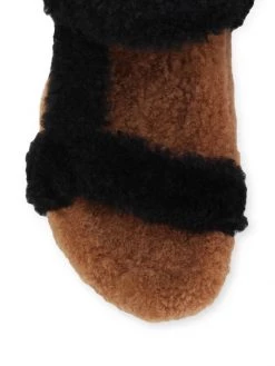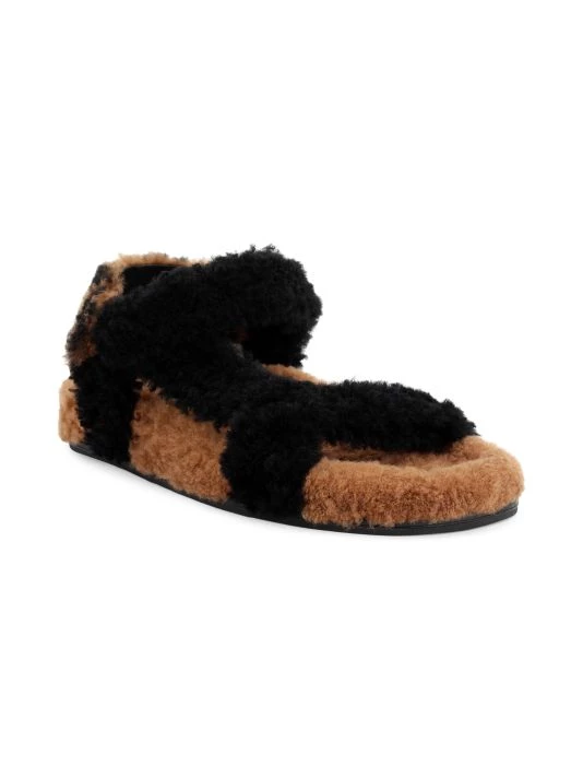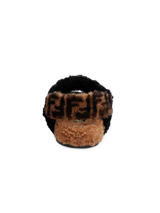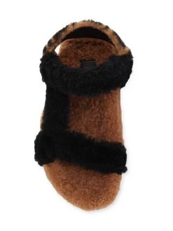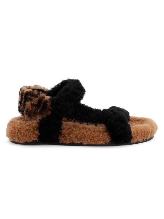 Rendered in luscious shearling, these ultra-cozy sandals feature Fendi’s FF logo strap at back.