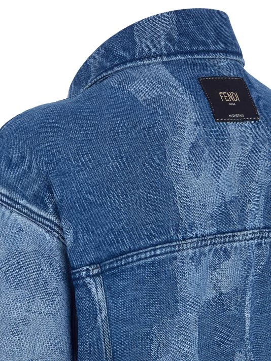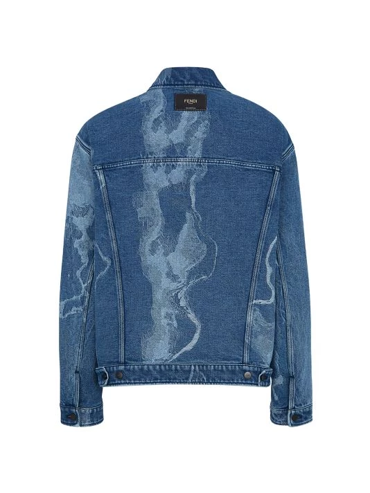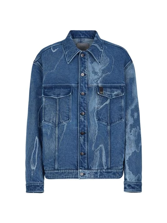 Featuring pastel and earth-tone intarsia shirts and shorts, and bombers depicting cityscapes, this collection reimagines inky nighttime silhouettes and aerial perspectives of land. Rich textures and abstract prints come together for a refined wardrobe with a boundary-breaking point of view.Crafted of a cotton blend, this denim jacket features a point collar and is adorned with flap pockets at the chest.