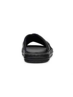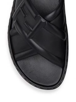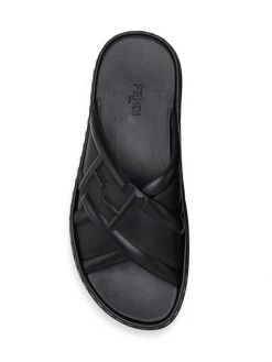Featuring pastel and earth-tone intarsia shirts and shorts, and bombers depicting cityscapes, this collection reimagines inky nighttime silhouettes and aerial perspectives of land. Rich textures and abstract prints come together for a refined wardrobe with a boundary-breaking point of view. These leather slip-on slides flaunt crossover straps embossed with the iconic FF motif.