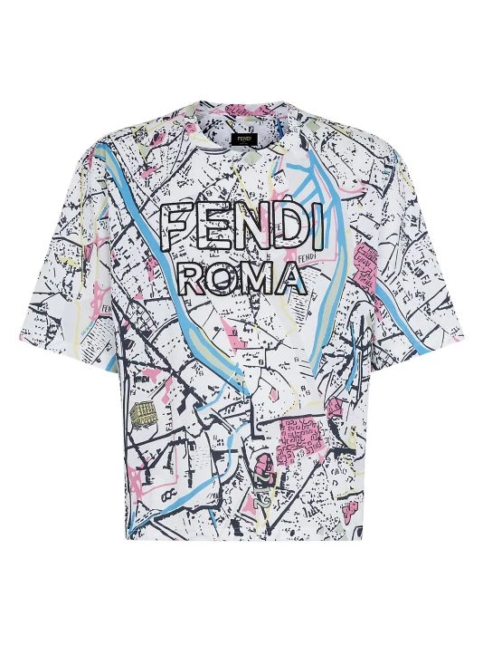 Featuring pastel and earth-tone intarsia shirts and shorts, and bombers depicting cityscapes, this collection reimagines inky nighttime silhouettes and aerial perspectives of land. Rich textures and abstract prints come together for a refined wardrobe with a boundary-breaking point of view.Made of cotton, this shirt features a map print and sports the brand logo on the chest.