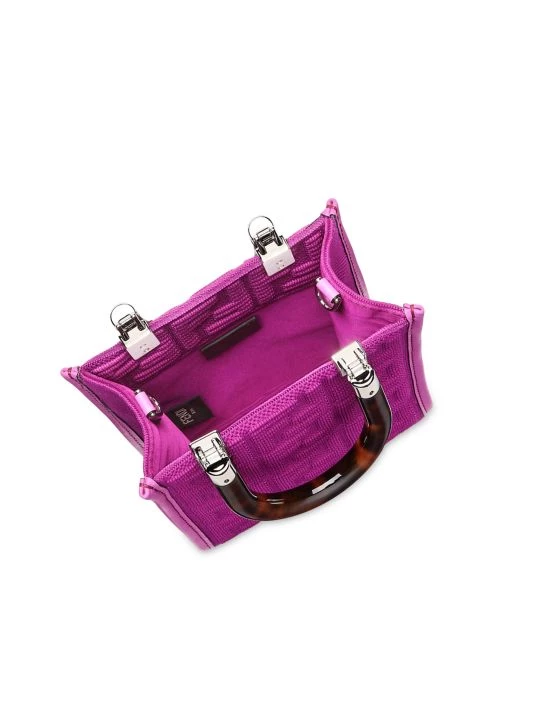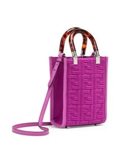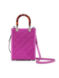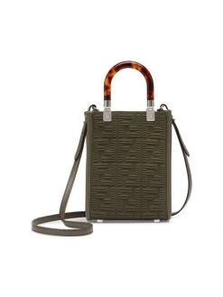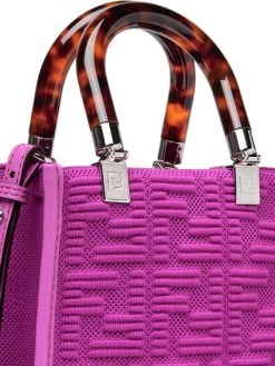 This mesh tote is decorated with Fendi’s allover FF logo featuring tortoiseshell plexiglass handles. A removable leather strap accompanies the accessory for hands-free sophistication.