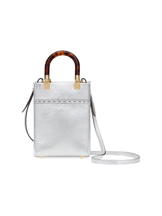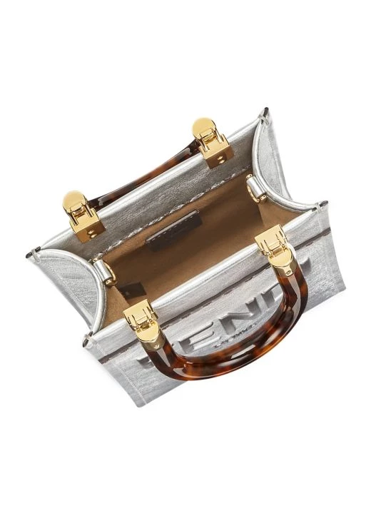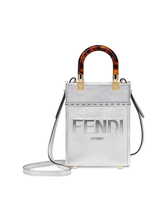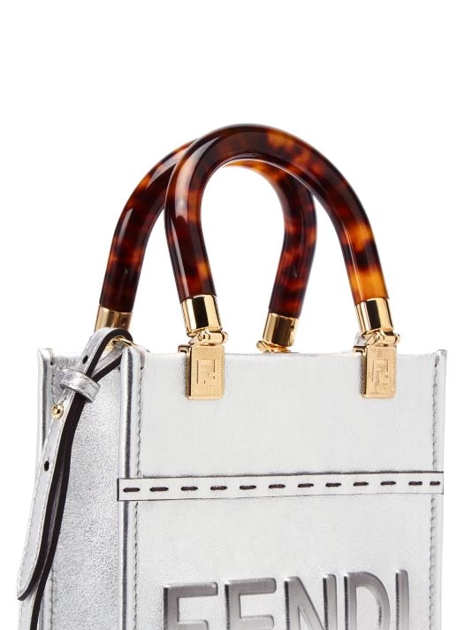 Made in Italy of eye-catching metallic leather, Fendi’s Mini Sunshine shopper features an embossed logo on the front. This piece is finished with tortoiseshell plexiglass handles and a removable shoulder strap.