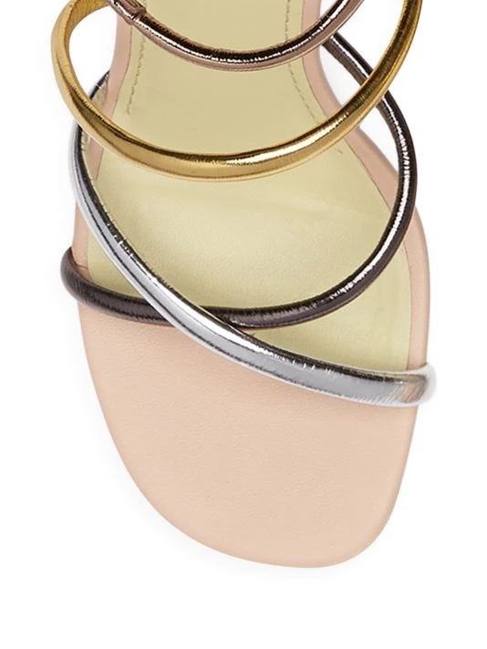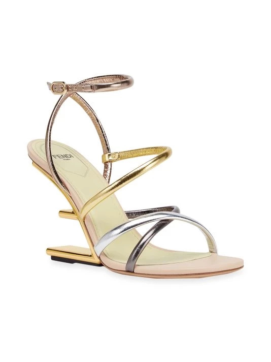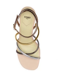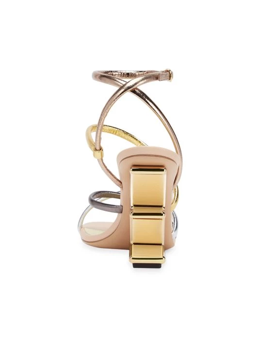 Anchored by a sculptural F-shaped heel, Fendi’s sandals boast a multicolored metallic leather strappy construction. This Italian-made pair is fastened with a dainty ankle strap.