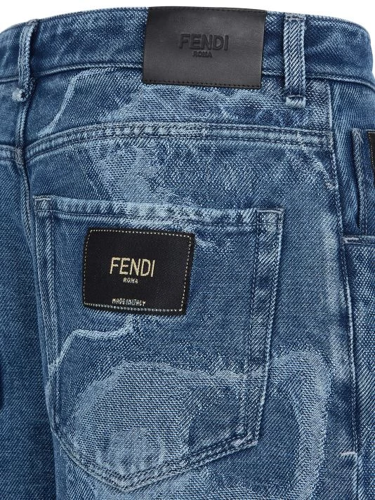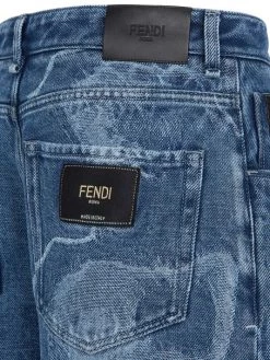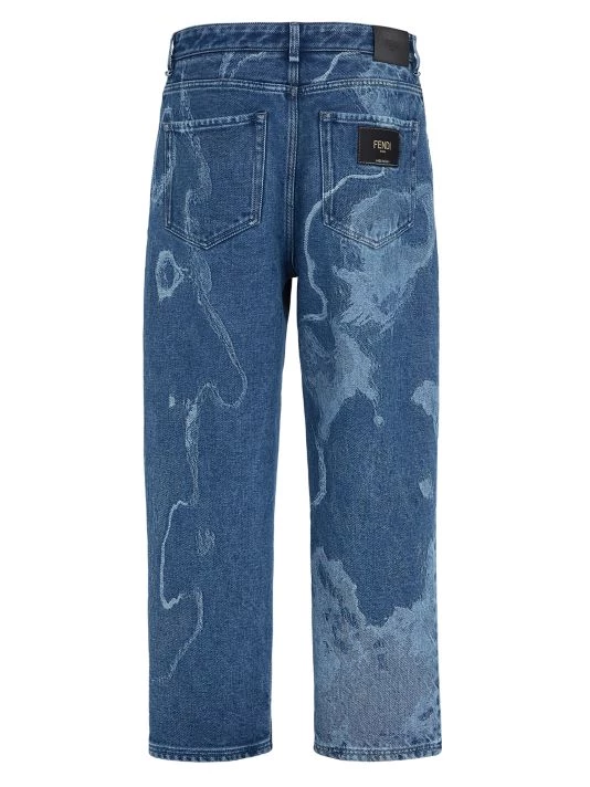 Featuring pastel and earth-tone intarsia shirts and shorts, and bombers depicting cityscapes, this collection reimagines inky nighttime silhouettes and aerial perspectives of land. Rich textures and abstract prints come together for a refined wardrobe with a boundary-breaking point of view.Crafted of a cotton blend, these jeans feature a classic five-pocket style and are adorned with a leather logo patch at the back of the waistband.