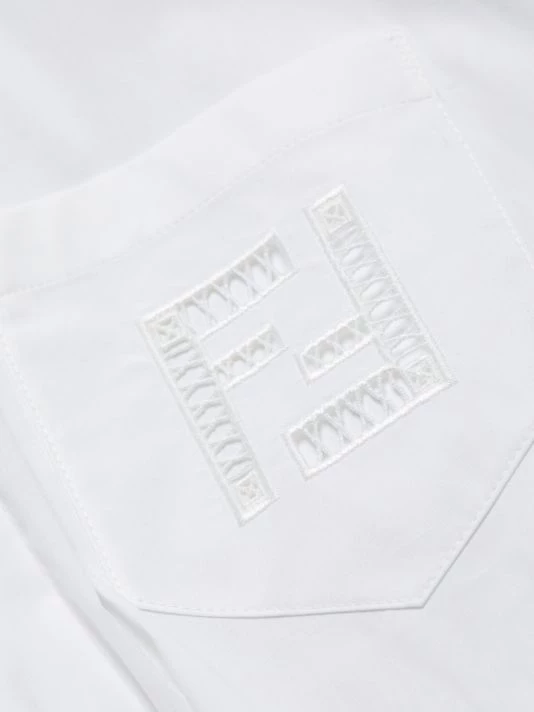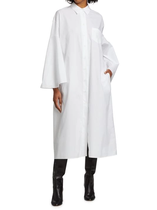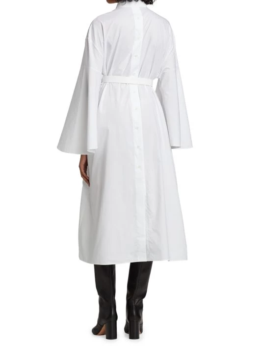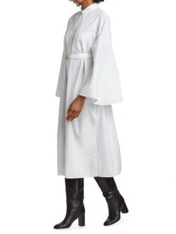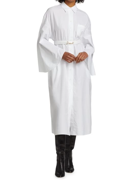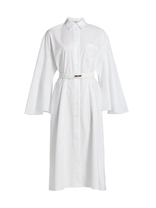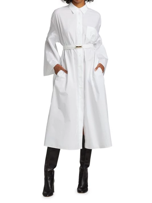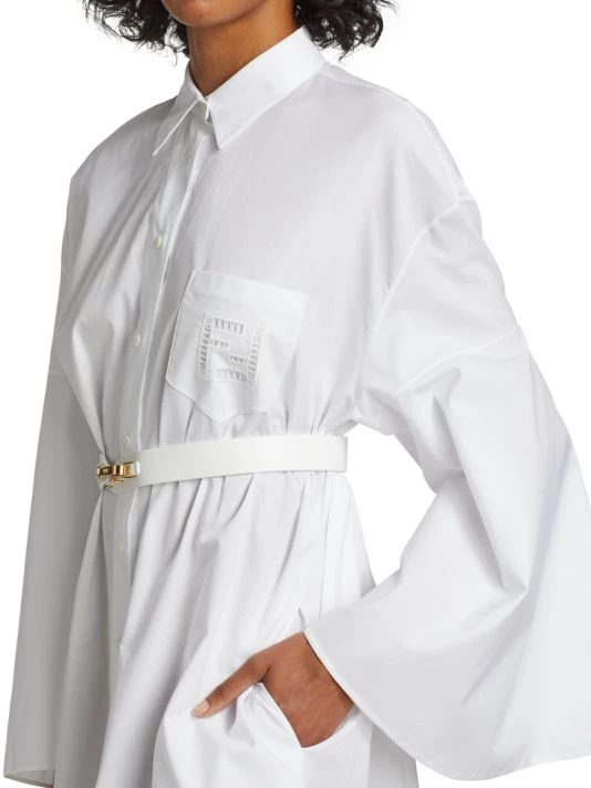 Poplin shirt dress with subtle brand embroidery at patch pocket and optional belt featuring goldtone logo.