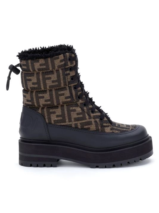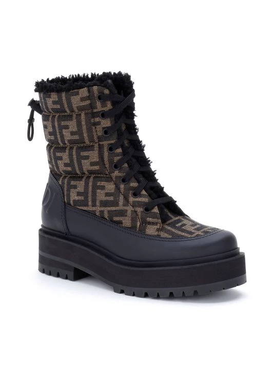 Mounted on a hefty lugged sole, this quilted ankle boot is dressed in Fendi’s FF monogram lined with genuine sheep fur.