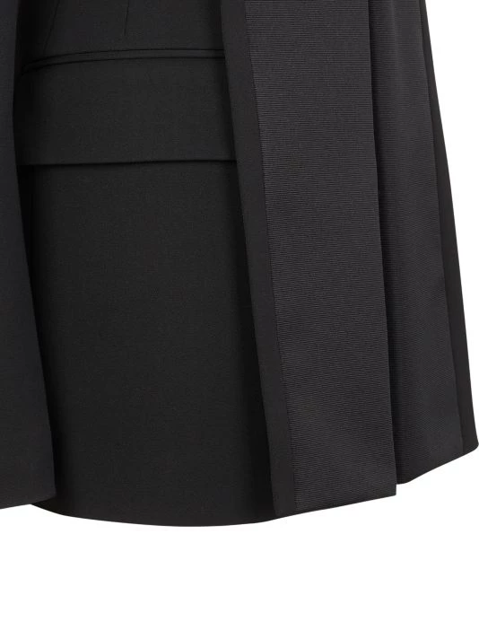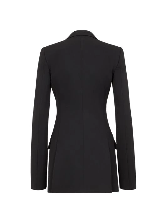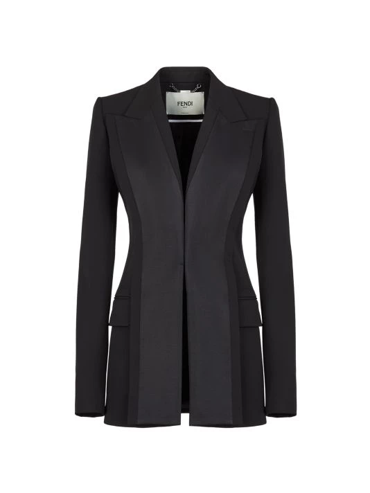 Structured wool jacket with contrast front paneling and breezy back slits.