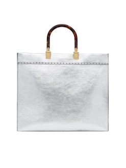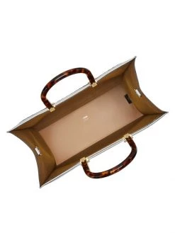 Made in Italy of eye-catching metallic leather, Fendi’s Sunshine shopper features an embossed logo on the front. This piece is accompanied by tortoiseshell plexiglass handles and a removable shoulder strap.